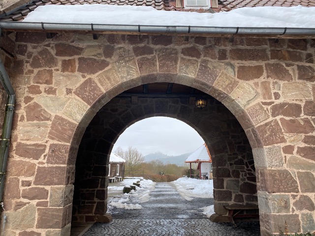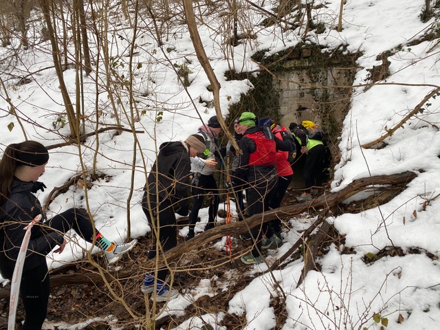 Oben an der Burg kommt ganz kurz die Sonne raus, aber schon 2 Minuten später es ist wieder bedeckt. Im folgenden, sehr schweren Abstieg sind wir zu viert: Chrissy, Katica und Marco sind bei mir. In Werleshausen finden wir den VP und stärken uns. Swen trifft ein, er hat die folgende 13 km Runde bereits fertig: „Sauschwer, sehr tief und sehr glatt!“, berichtet er. Während er Richtung Ziel rennt machen wir uns auf den Weg auf die Runde zur Teufelskanzel. Nach 200 Metern stelle ich fest: Meine Stöcke stehen noch am VP. Mist, also zurück!