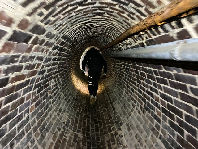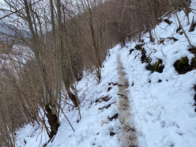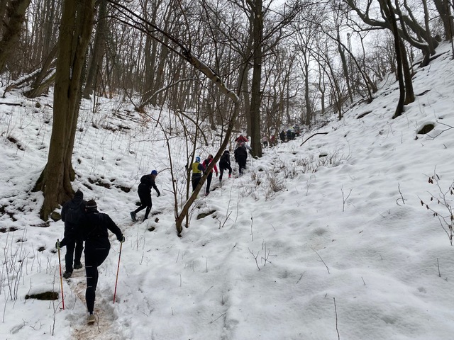 Nach dem Tunnel steht der Anstieg auf den Sponberg an. Auf dem vereisten, rutschigen Weg kommen wir kaum voran. Da wir dann noch den Ausstieg zu der Treppenanlage verpassen, quälen wir uns zum Schluss gefühlt senkrecht hinauf.