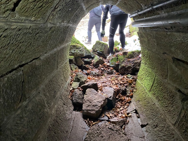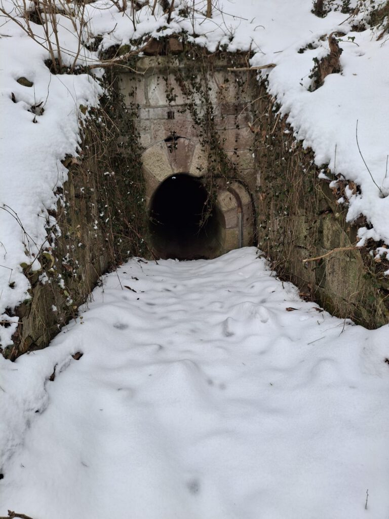 Im Tunnel ist es wider Erwarten trocken! Wir hatten nach dem leichten Tauwetter gestern einen kleinen Bach erwartet. Vor mir duckt sich Stefan durch den Tunnel. Auch am Ausstieg gibt es keine nassen Füße, da hatte Gerno doch zuviel versprochen.