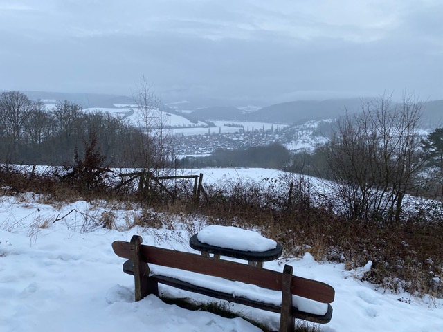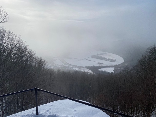 Nun entlang der Werra Richtung Lindewerra. Bald bin ich in Thüringen. Der Kolonnenweg biegt nun links ab. Der Spaß beginnt. Von der Werra bis oben zur Aussicht sind es 1,3 km und 250 hm, wobei die Steigung immer weiter zunimmt. Endlich oben! Eine kurze Pause muss sein für den Blick ins Werratal, von wo der Aufstieg begann. Aber ich muss weiter. Ich bin noch immer nicht ganz oben. Ein Single-Schnee-Trail führt weiter bergauf. Hier waren nur wenige Leute vor den Läufern, die Spur ist nicht fest. Große Vorsicht, bloß nicht umknicken!