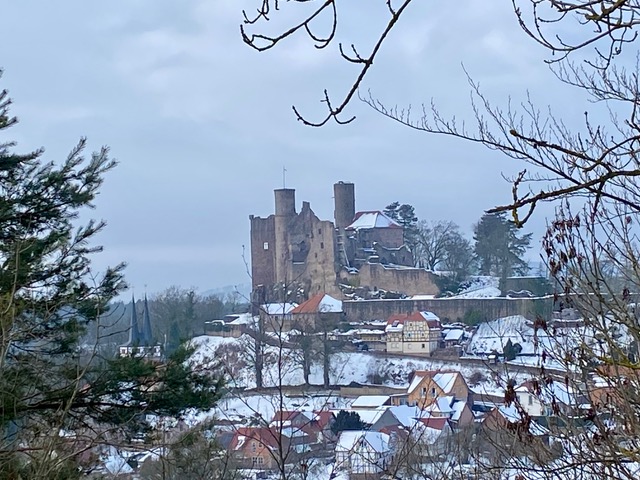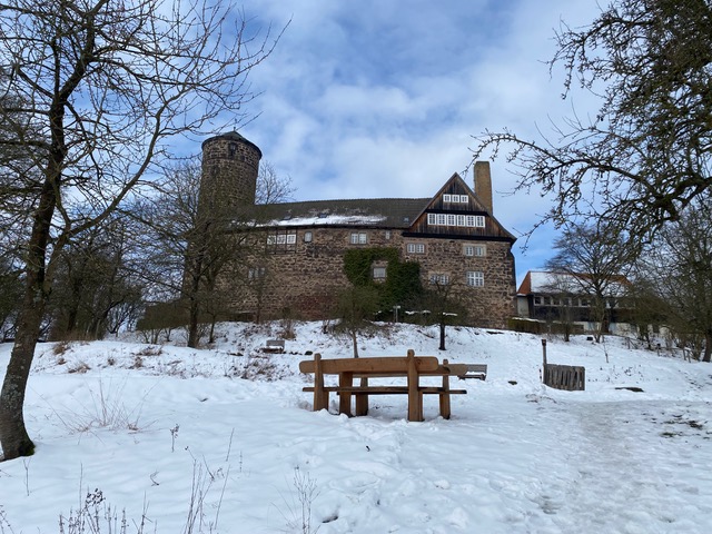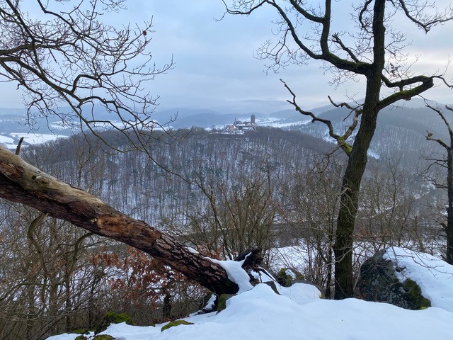 Die Ketten sind besonders im Abstieg oder wie hier bei hängendem Gelände sehr hilfreich. Immer wieder sehe ich Abdrücke von abgerutschten Läufern im Schnee. Nach dieser Passage steht der Aufstieg zur Burg Ludwigstein auf dem Programm.