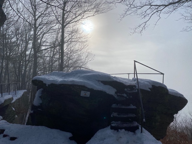 Die Stufen auf den Felsen sind total vereist. Aber mit den Yaktrax ist es kein Problem. Oben ein Foto mit Aussicht und vorsichtig wieder runter vom Felsen. Ein Blick zum Handy zeigt, der Akku ist bald leer. Also kurze Pause an der Hütte und die Powerbank mit dem Handy verbinden. Pling, das Handy lädt!