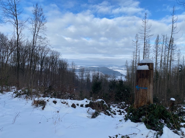Der höchste Punkt unserer Strecke: die Junkerhöhe auf Höhe 511 Metern NN. Markiert mit einem Holzhindernis. Danach geht es 1,5 Kilometer mitten durch den Wald, immer schön der Spur folgen! Bis zur Teufelskanzel verliere ich etwa 60 Höhenmeter. Als ich etwas tiefer komme spüre ich, dass es taut. Die feuchten, seifigen Stellen werden mehr. Schnee, Eis und Sulz wechseln sich ab. Konzentration ohne Ende! Felsen tauchen auf und ich erkenne die Hütte an der Kanzel, da eine Funzel leuchtet. Kurz vor der Funzel biege ich rechts ab und komme durch den Schnee zum Felsen.